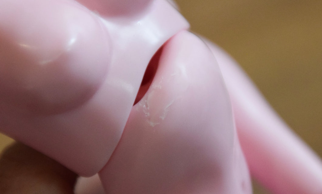 This is a Discounted doll due to the many defects present in her resin. The most obvious spots are marbling in her right knee under the thigh joint and a crackling in her resin under her chest where her casting channel was removed. She also has a slightly warped shaped left knee and right shoulder.